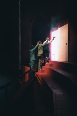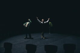 Preparing for a big announcement to be made which will affect the future mankind, the couple greet imaginary guests and reminisce about past times but ultimately the empty chairs and invisible crowd become a metaphor for the reality of unreality.